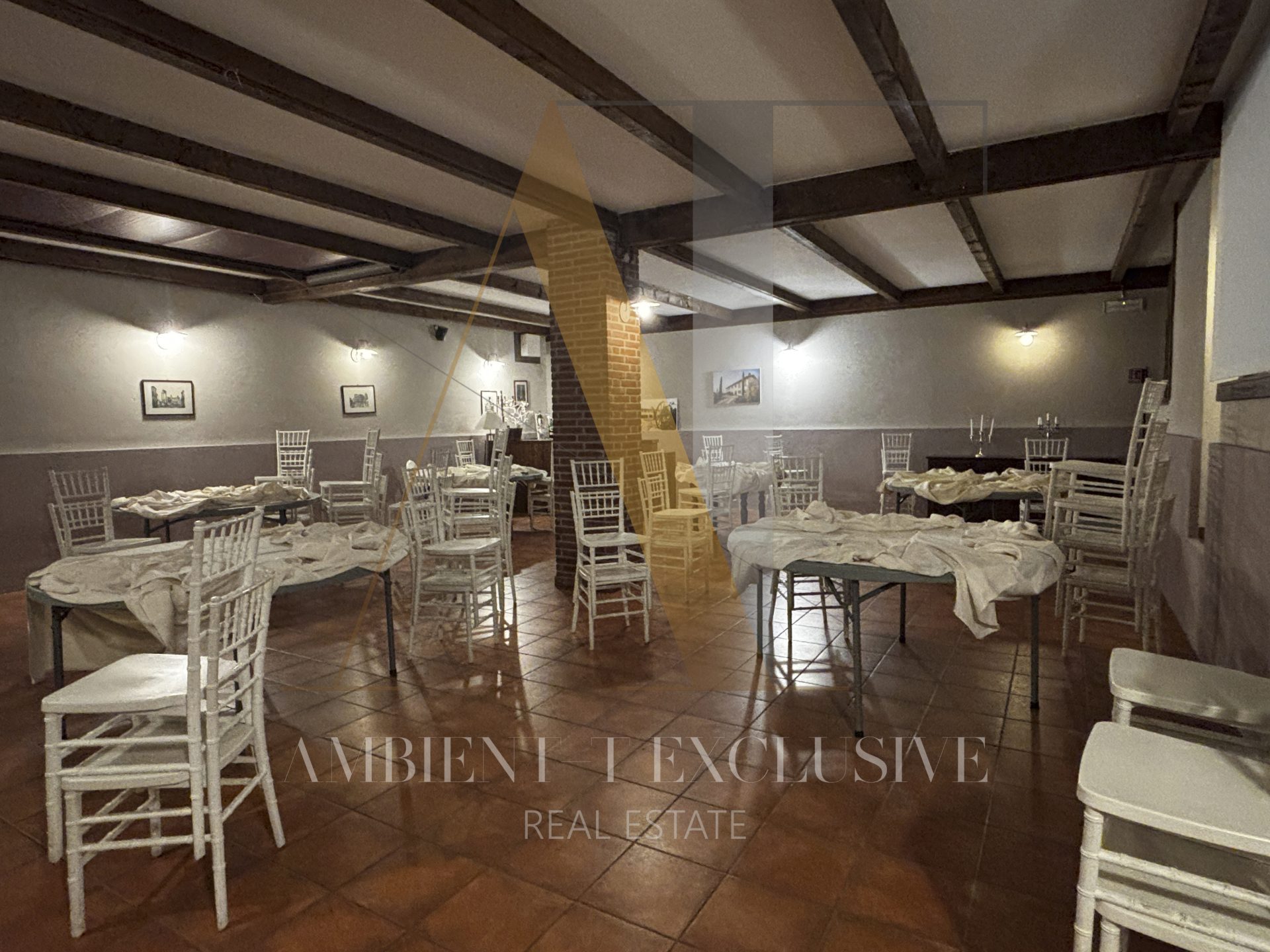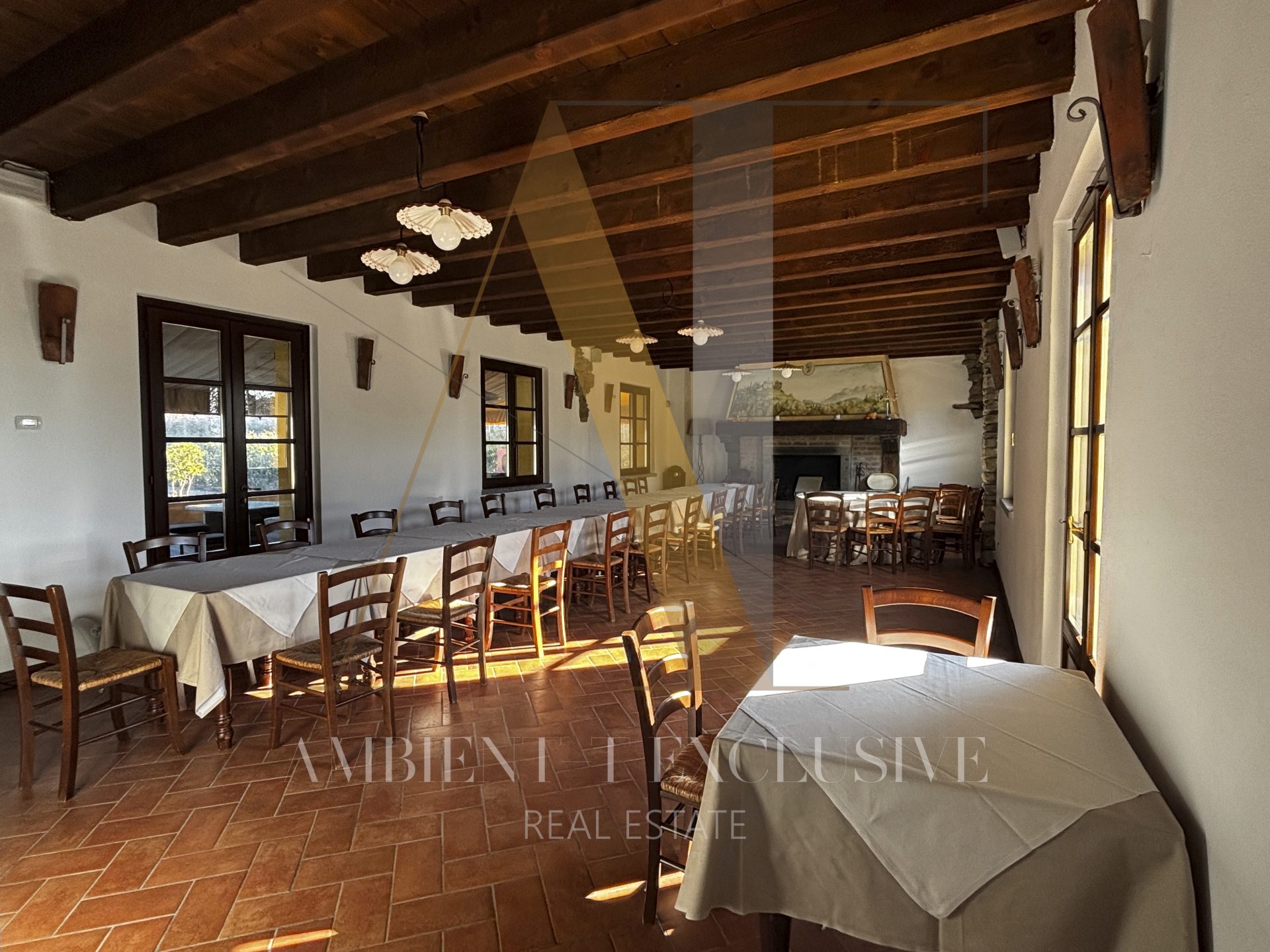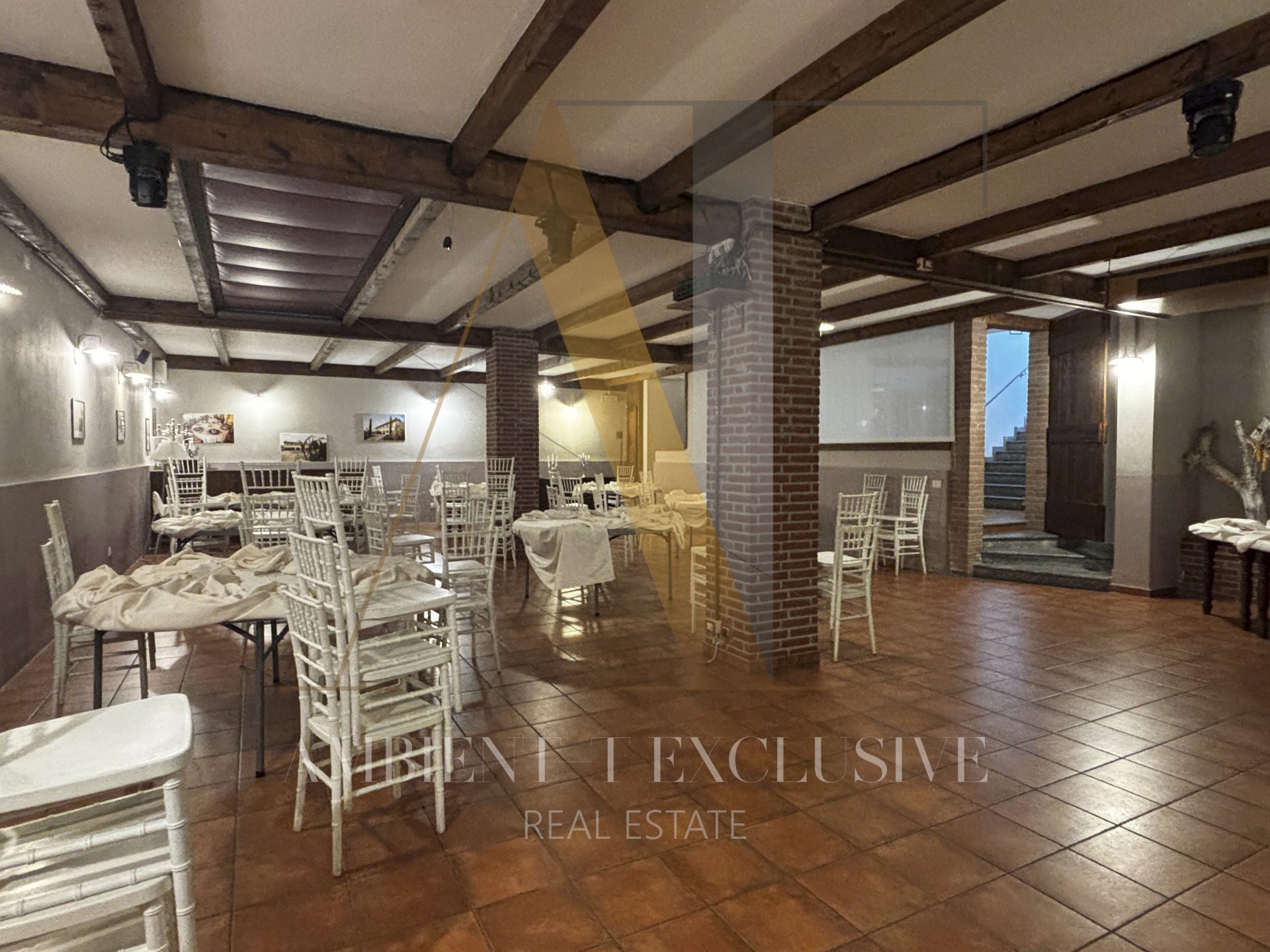 - Il piano terra di 150 mq è destinato a commerciale e ospita il salone con camino in pietra, la zona bar, la cucina professionale, il dehor di circa 100 mq. Il piano è collegato con ascensore al livello interrato.