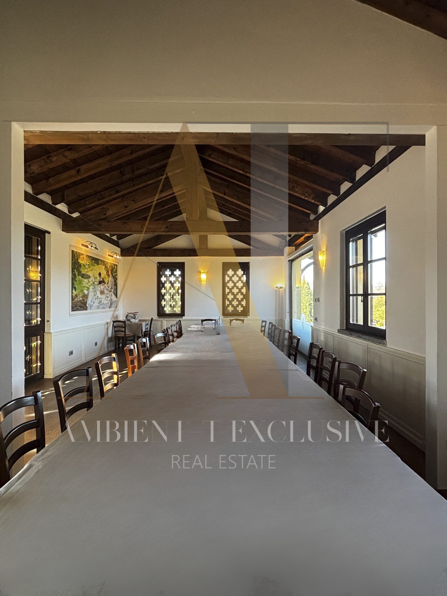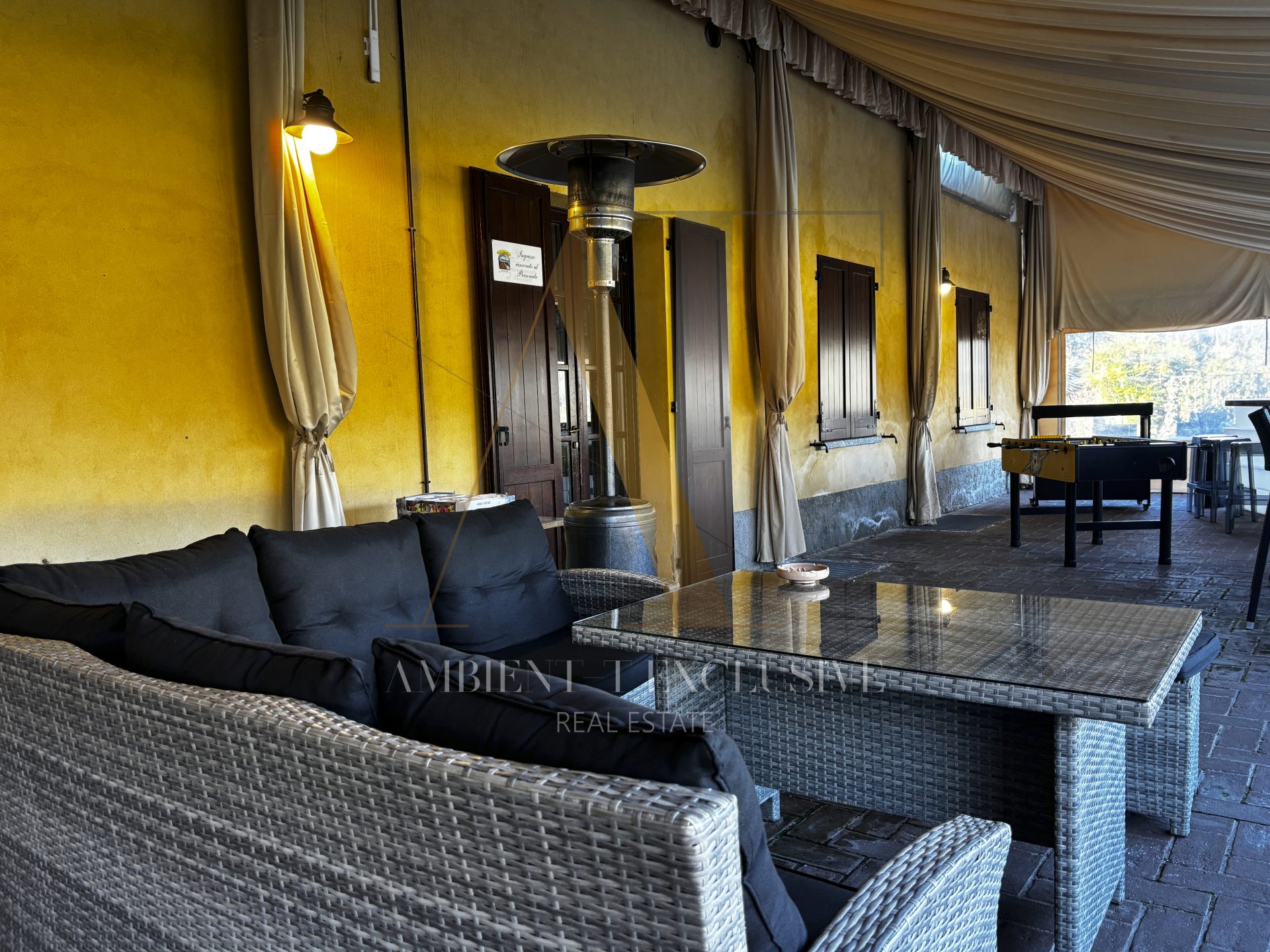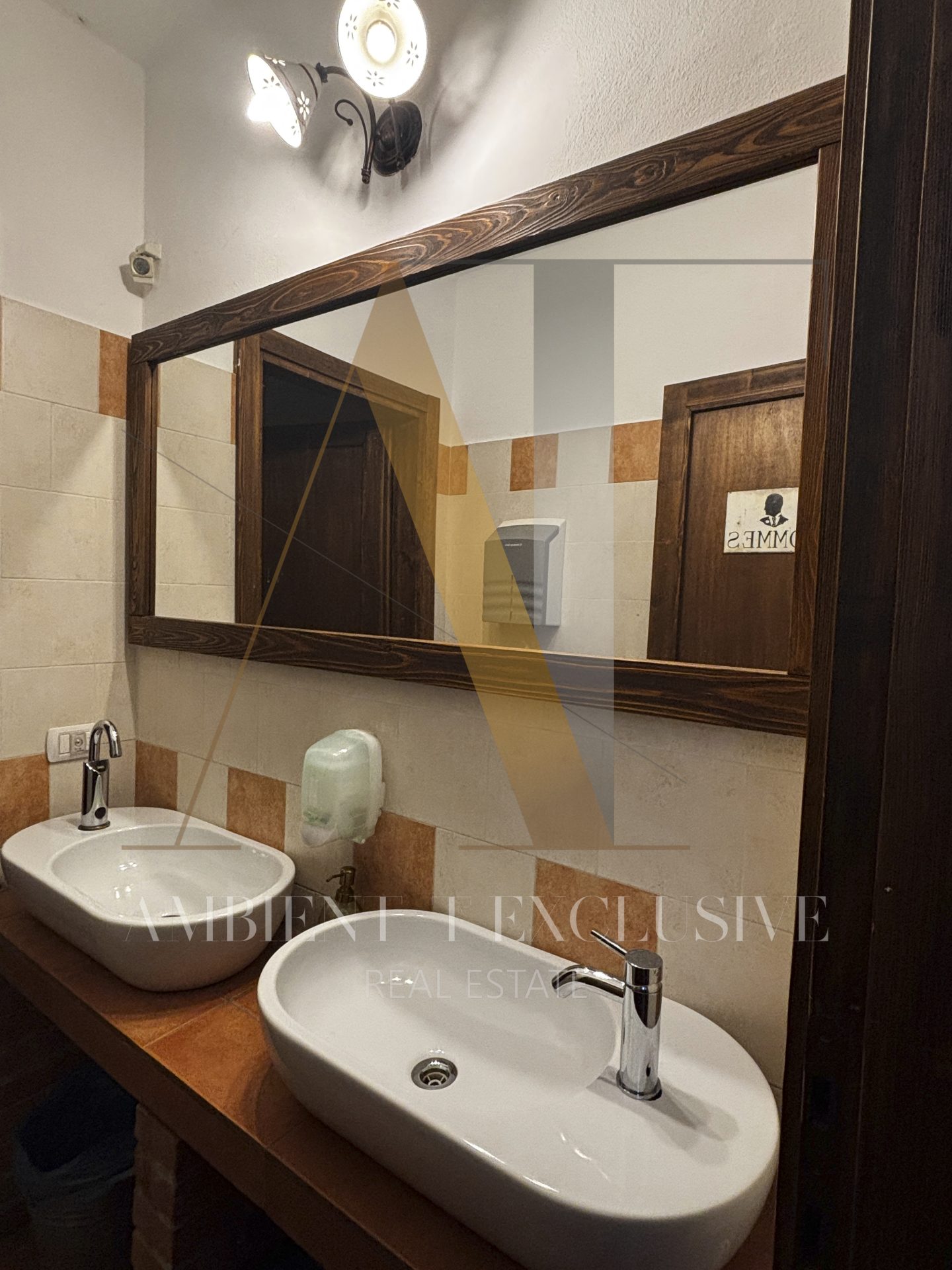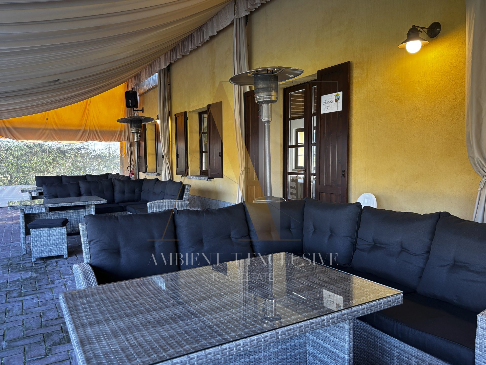 - Il piano terra di 150 mq è destinato a commerciale e ospita il salone con camino in pietra, la zona bar, la cucina professionale, il dehor di circa 100 mq. Il piano è collegato con ascensore al livello interrato.