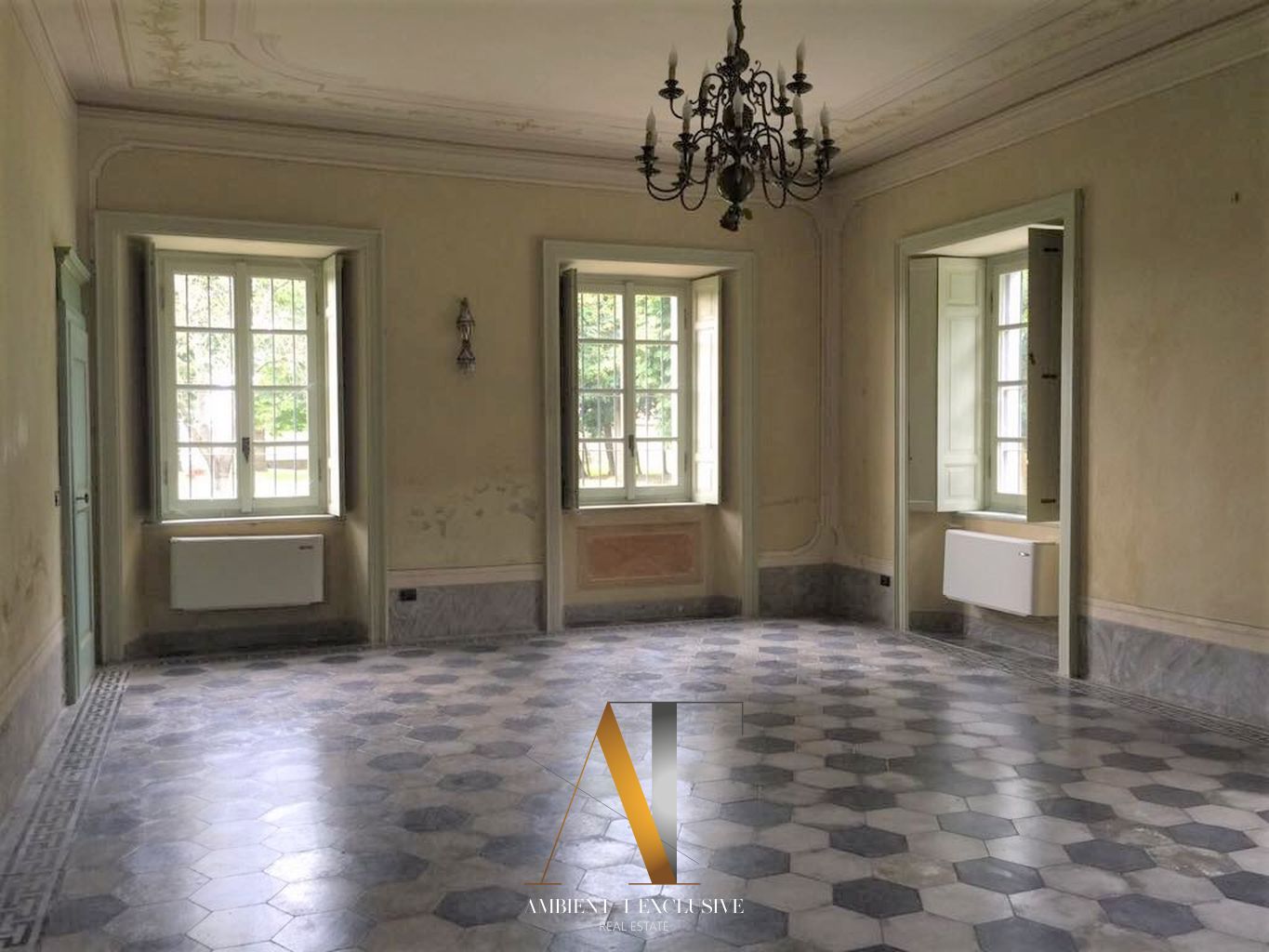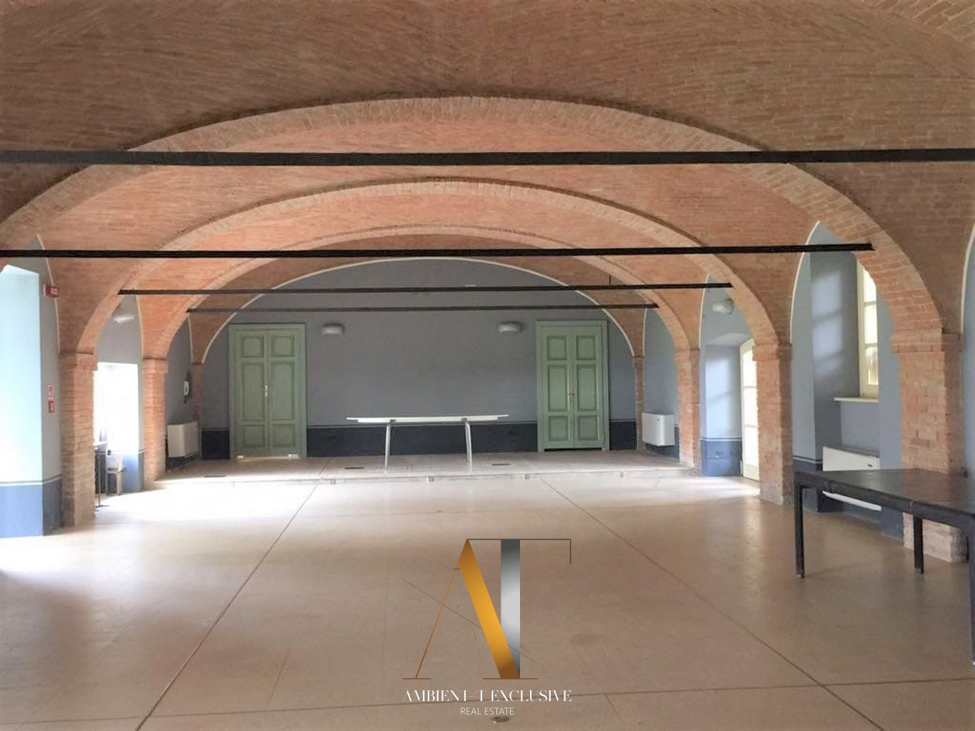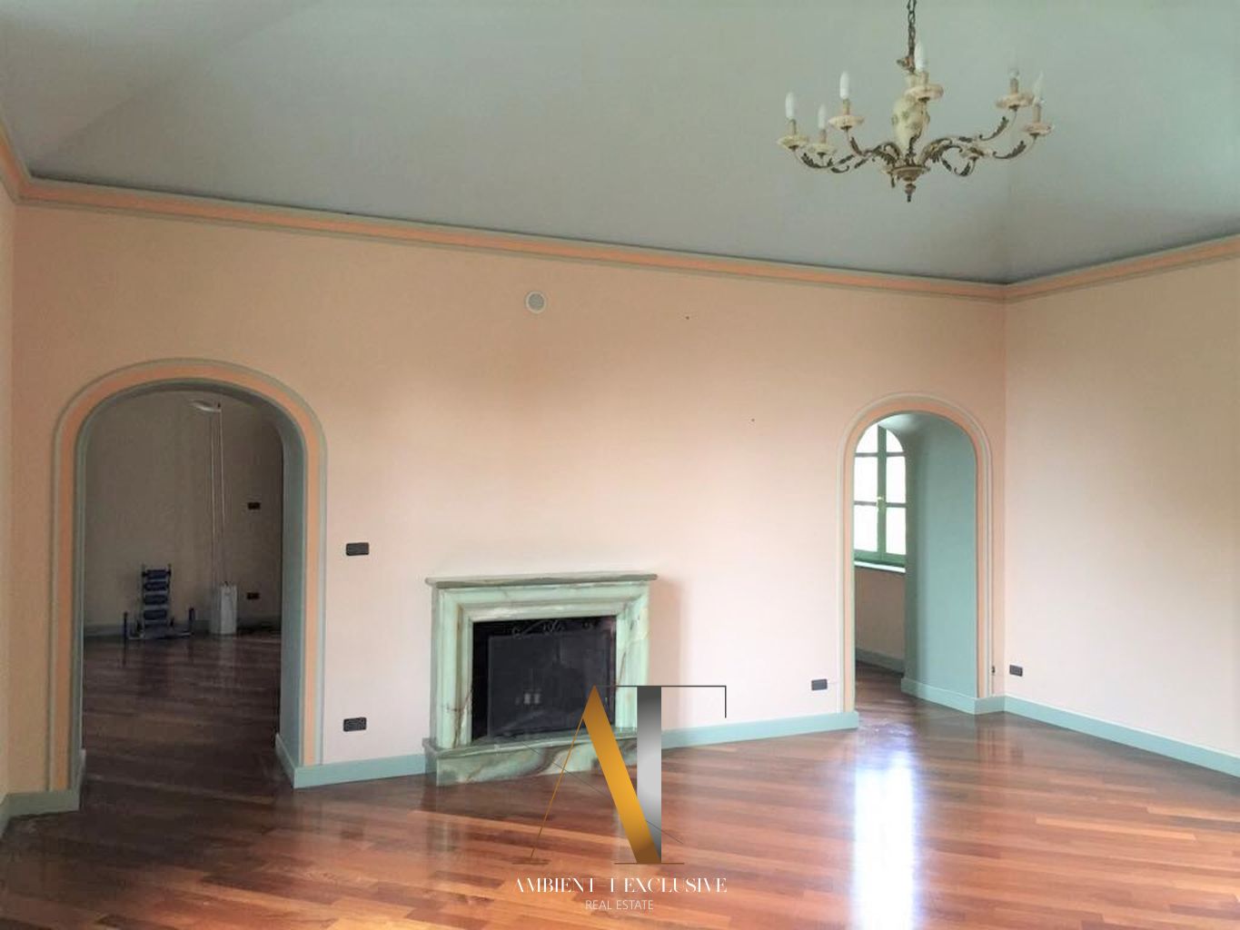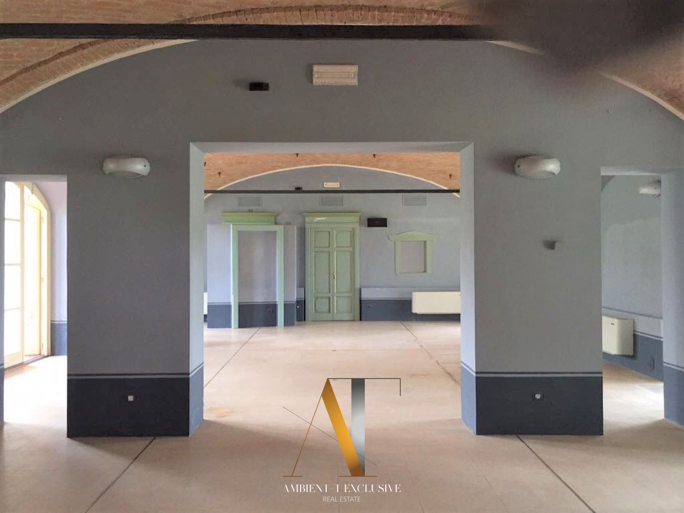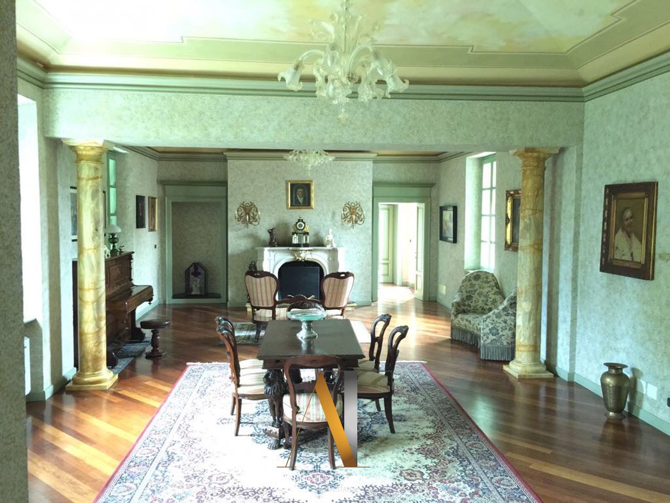 Al piano terra si trovano ambienti di grande fascino, arricchiti da affreschi originali dell’Ottocento. Il vasto salone di circa 200 mq, oggi adibito a concerti, conferenze, ricevimenti e banchetti, rappresenta il cuore della dimora.
