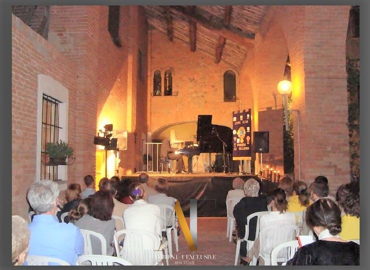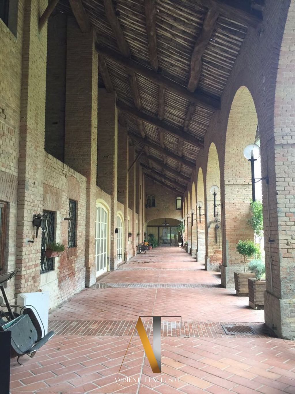 Attraversando il maestoso portone in legno si accede a un ampio cortile interno, impreziosito da un curato prato all’inglese e da un suggestivo porticato di circa 45 metri, spesso utilizzato, soprattutto nelle serate estive, per concerti e rappresentazioni teatrali, grazie anche a un accurato impianto di illuminazione.