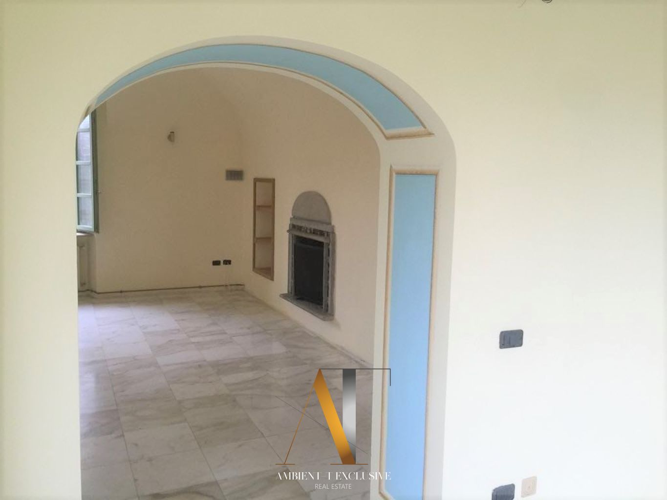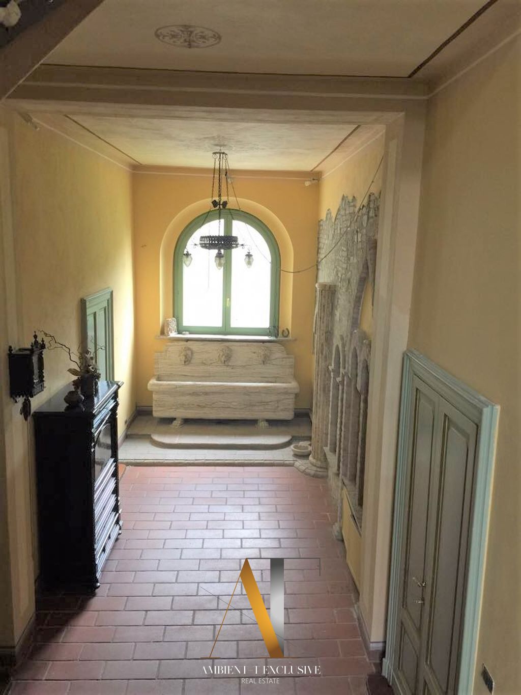Il primo piano, oggetto di restauro conservativo negli ultimi decenni, ha mantenuto intatto il suo stile originario, arricchito da decorazioni e tinteggiature d’epoca, colonne e fontane marmoree e da una splendida collezione di camini antichi, tra cui un pregiato esemplare in marmo bianco di Carrara, proveniente da un antico castello francese.