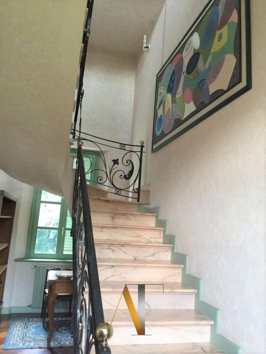 Una scala in marmo rosa con elegante ringhiera in ferro battuto conduce al secondo piano, dove si incontrano ambienti di gusto contemporaneo: l’uso sapiente del legno, dei marmi pregiati e di elementi di design moderno dà vita a un’atmosfera raffinata e accogliente, in perfetto equilibrio tra storia e comfort attuale.