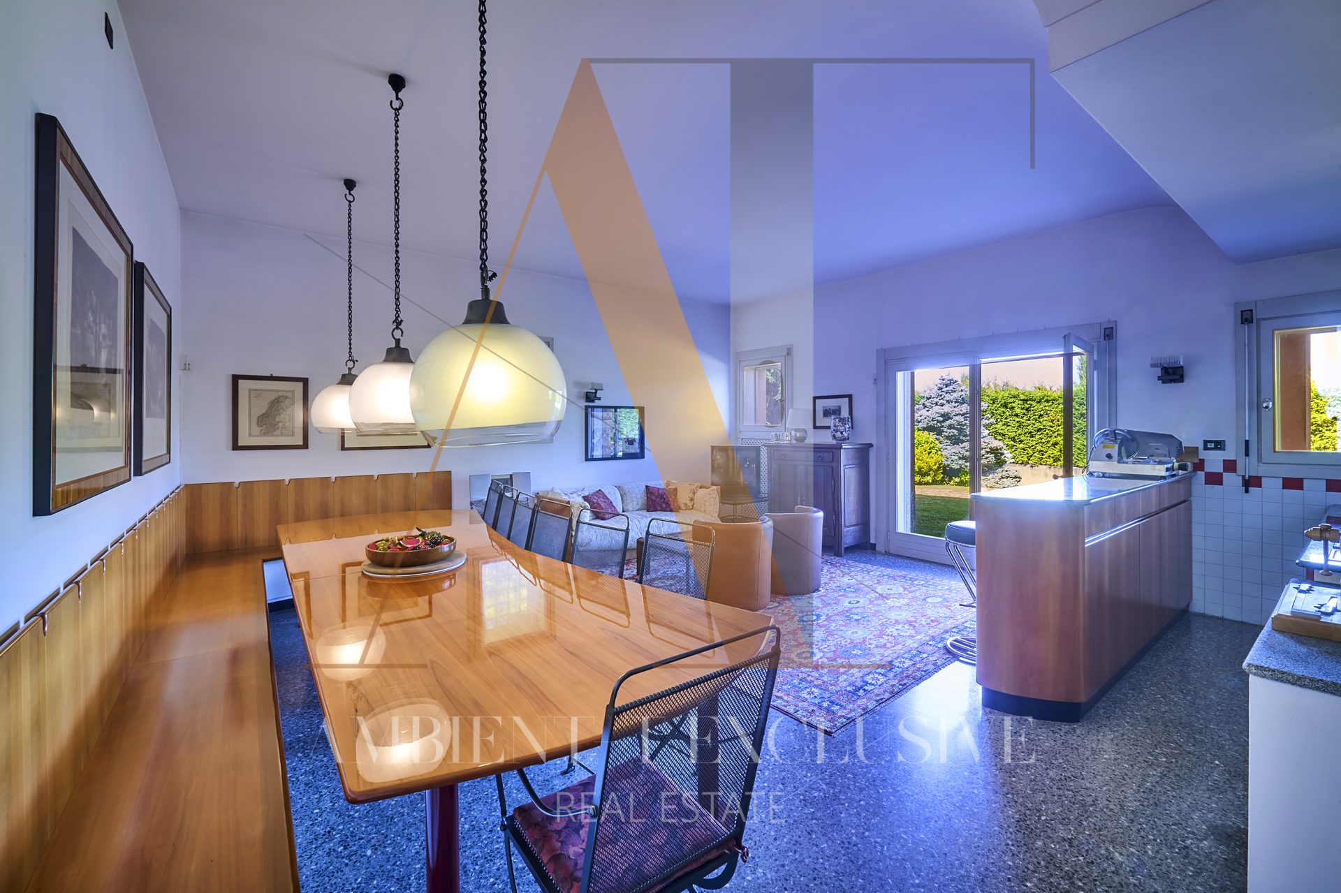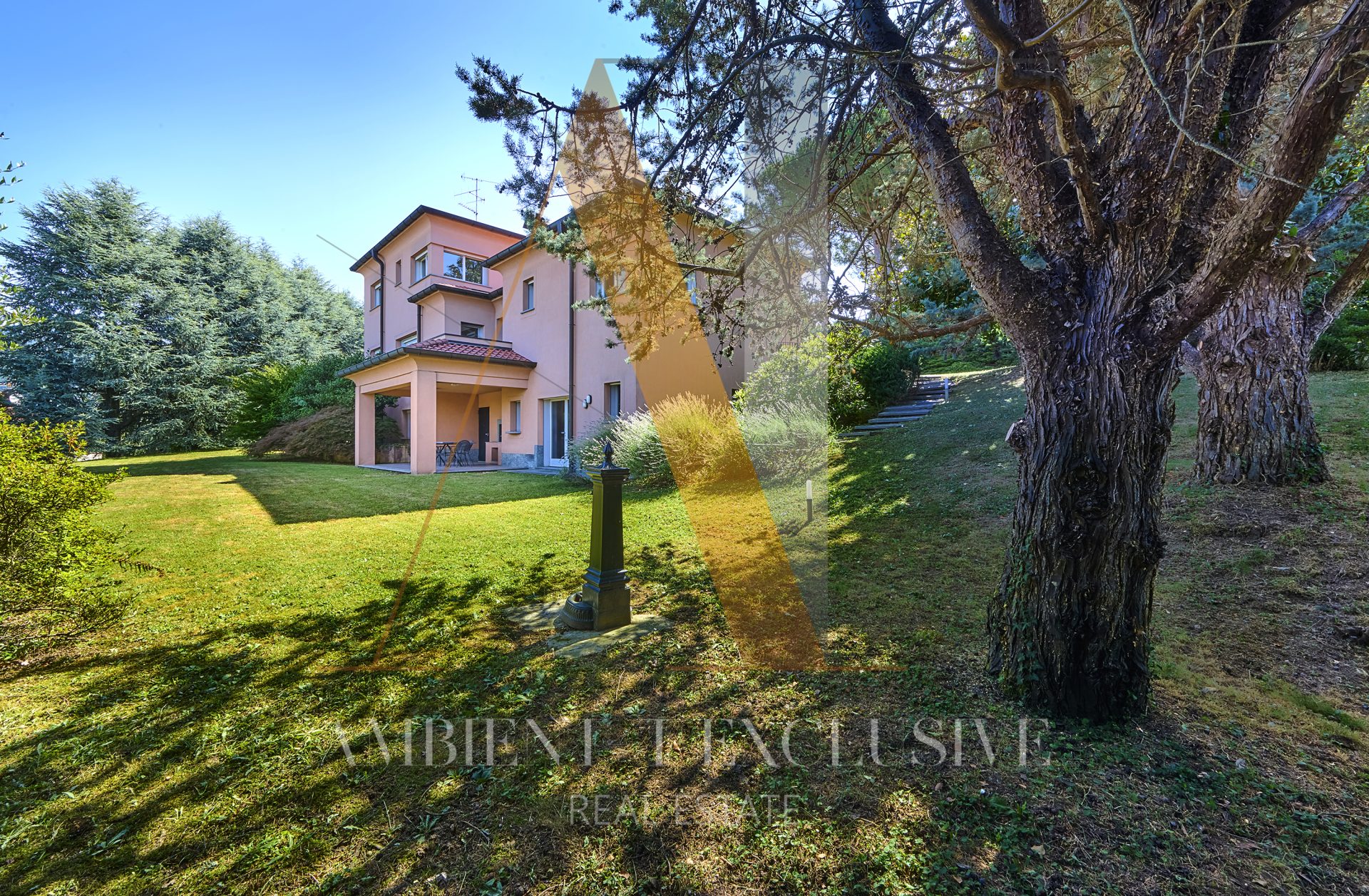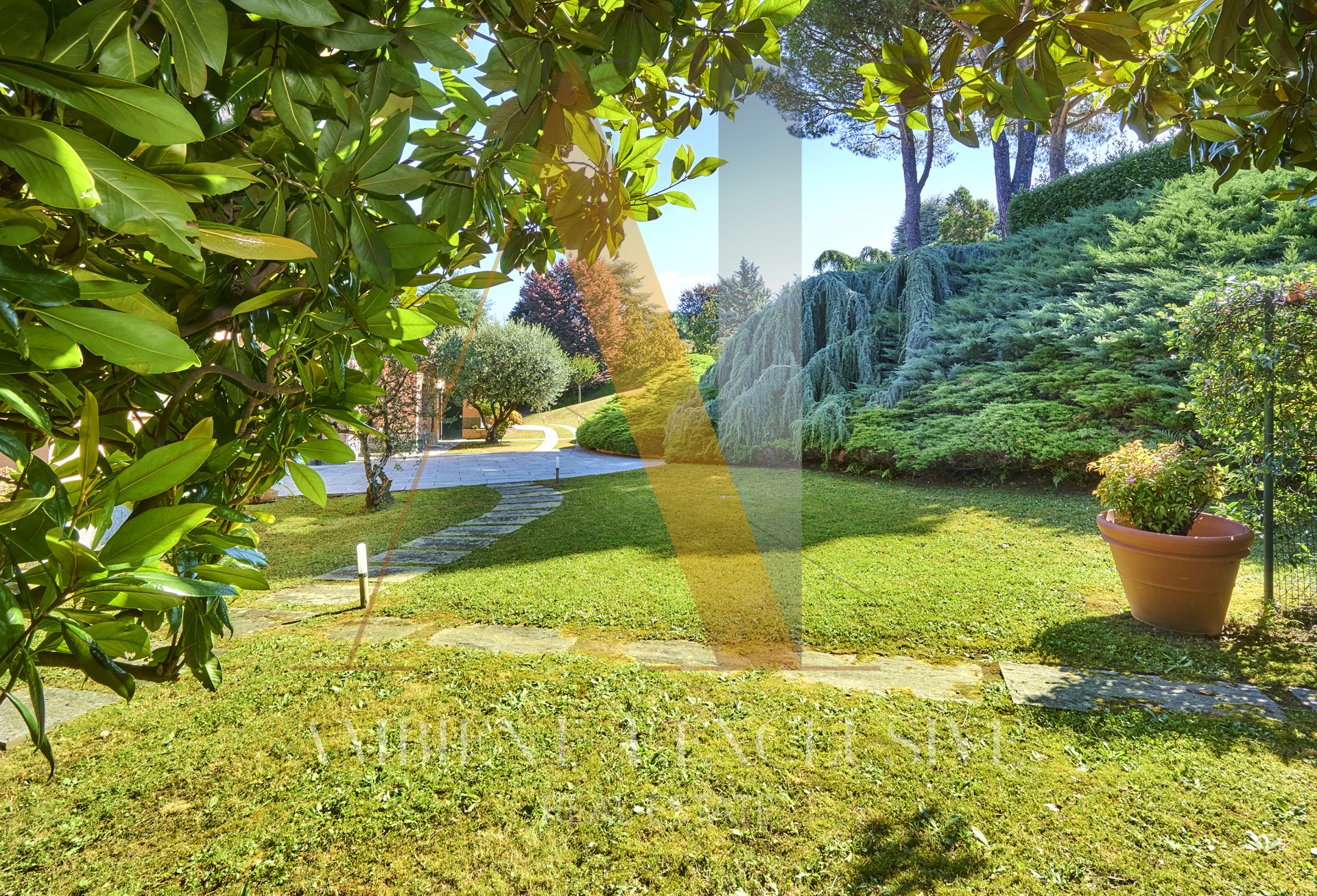 OGGIONO, COLLINA DI IMBERIDO: Affacciata sul Lago di Annone, una delle propaggini a sud del Lago di Como, si distende una importante proprietà unifamiliare progettata dall’Arch. Gregorio Caccia Dominioni nel 1988; un ampio e curato giardino digrada verso il lago e circonda una villa di alto standing, studiata dal proprietario per accogliere la propria famiglia e frequenti ospiti: la villa è infatti strutturata sostanzialmente in tre parti: quella centrale, con due piani fuori terra dedicata alla famiglia, quella a sud-ovest per gli ospiti e quella a nord-est adibita a casa dei custodi.