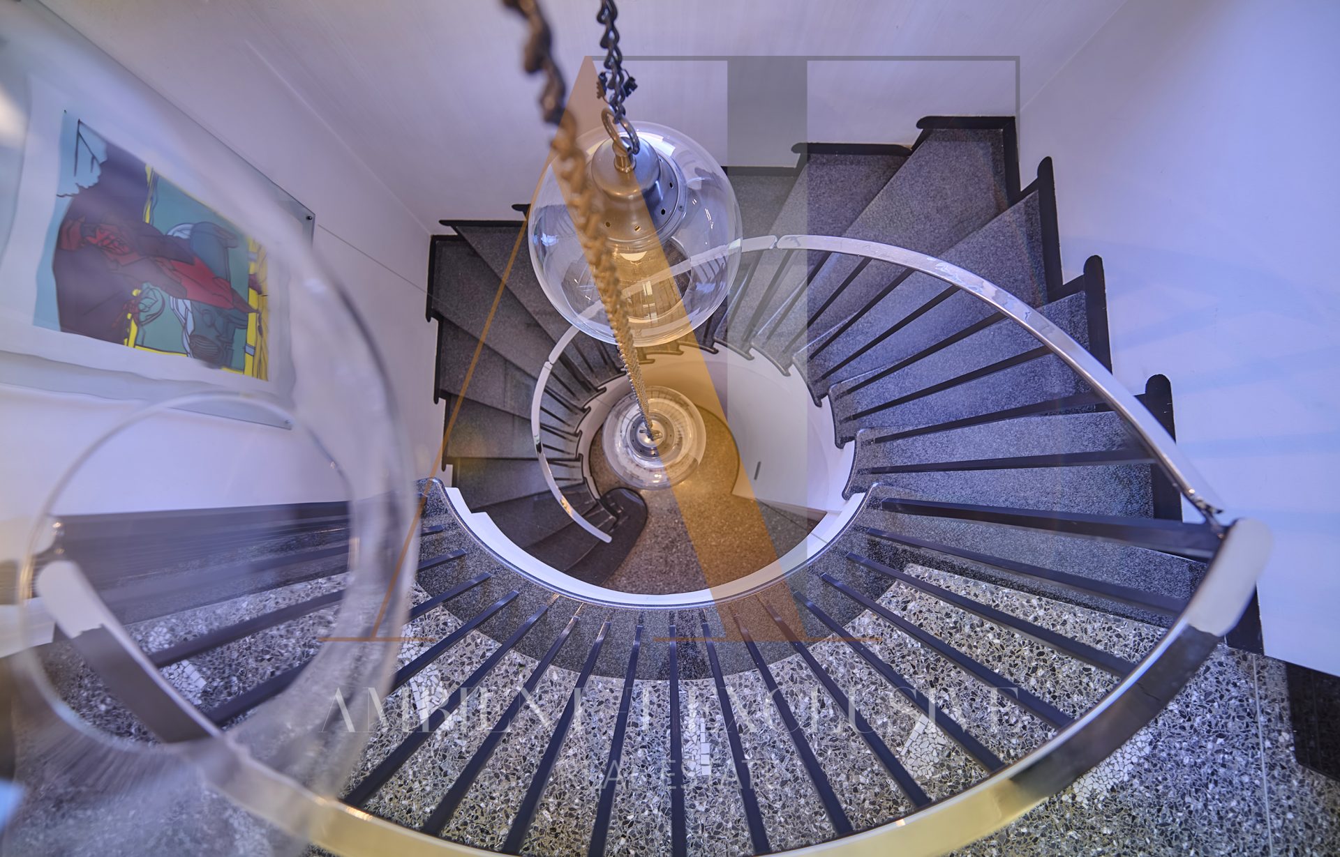 Di sicuro impatto scenografico la scala che porta al piano terra, nera e lucida, sia i gradini in nero-Africa, sia la ringhiera in ferro con corrimano cromati: da qui si accede all’ingresso principale e quindi alla zona giorno della famiglia e alla zona ospiti; quest’ultima composta da due camere con bagno e cabina armadio; di fronte il grande living della villa, suddiviso in zona camino, zona libreria e bar, zona conversazione centrale con grande finestra e vista sul lago e sulle montagne. Proseguendo ci accoglie una moderna e funzionale cucina con arredi laccati e su misura, caratterizzata da un ripiano in serizzo scuro dall’andamento sinuoso, che, se da un lato assolve la funzione di servizio della prima colazione, dall’altro costituisce un elemento di continuità fra il living e la zona di servizio, dove si trova una stanza adibita a guardaroba e stireria.