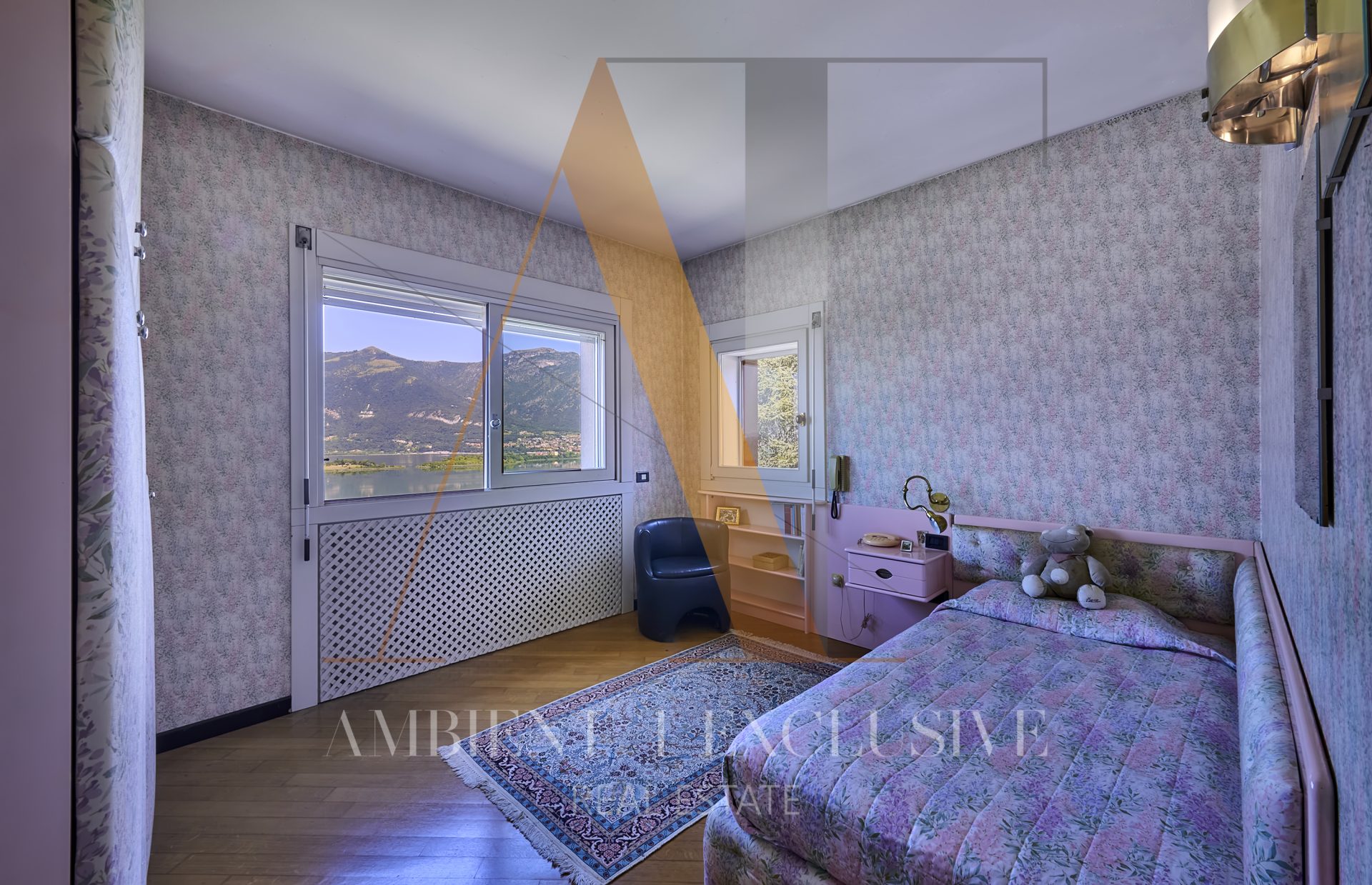 Al piano superiore la zona notte: la camera master con vista lago, bagno riservato e cabina armadio; altre due ampie camere, una con vista lago, l’altra con grande terrazza, e un bagno.